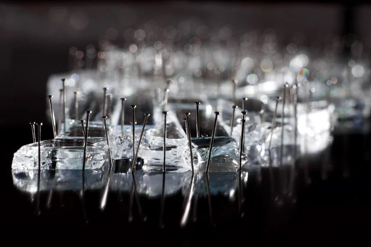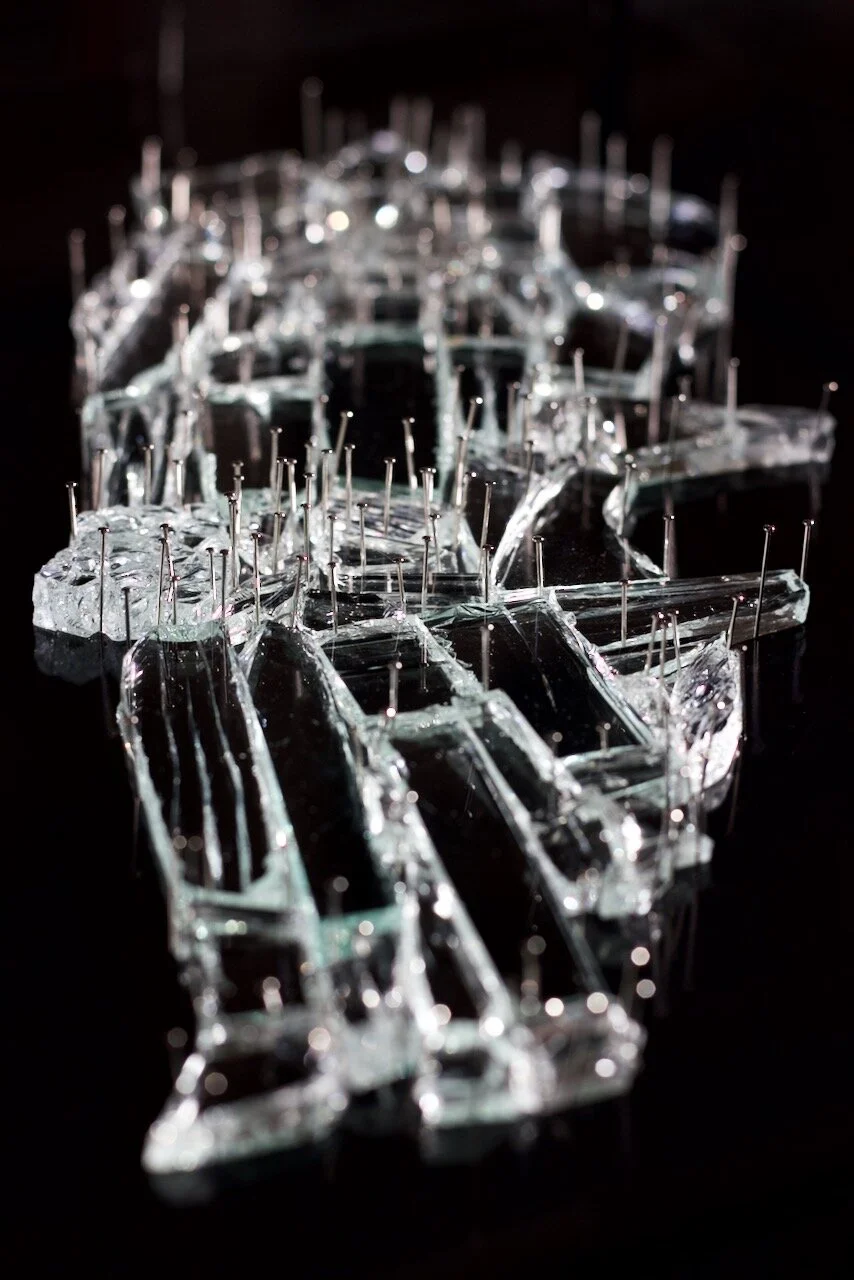 Made in the aftermath of the Beirut blast, ‘Les Brisés’ (The Shattered) was created with shards of glass collected from my damaged family home in Beirut. ‘Les Brisés’ represents a map of Lebanon that, despite being shattered, is desperately trying to stay whole. The only way the map can exist is thanks to the 204 pins holding together the shards of glass that compose it. (The pins, reminiscent of human silhouettes, represent the 204 victims of the blast (official number back in 2020)).
